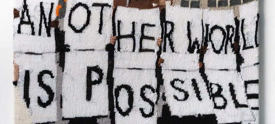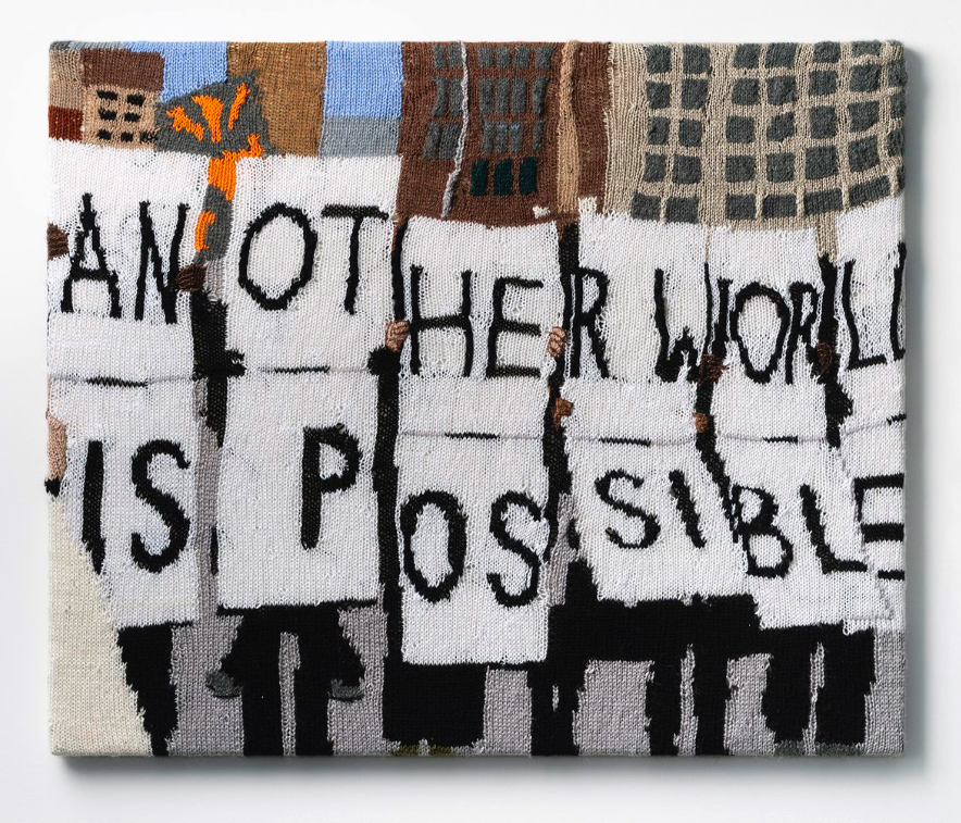 Kate Just, Another World is Possible, 2022, knitted wool, plywood, oak, 77 x 92cm. Photo: Simon Strong. Image courtesy the artist and Hugo Michell Gallery, Adelaide.